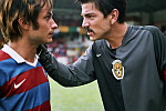 Tato (Garcia) and his brother Beto (Luna) live in a small town, where Beto, nicknamed Rudo (tough), is married to Tonia (Paz) and has two small kids and Tato dreams of becoming a singing sensation. Then Tato is spotted by a football scout (Francella) and taken to Mexico City to play with the pros. The media nickname him Cursi (fancy). Beto follows soon, and both struggle with the pressures of fame--Tato with a sexy TV-star girlfriend (Mas) and Beto with gambling problems. And they're about to face off in the match of their life. The film captures the football's global grassroots, as we meet these characters working in a banana plantation and devoting every spare minute to soccer. Like everyone, they have very big dreams. But even when their big breaks come along, it doesn't play out as imagined. While maintaining a light, comical tone, writer-director Cuaron (Alfonso's brother, intriguingly) never shies from the dark reality. Garcia and Luna are a terrific double-act, making the most of the script's bristling humour as the brothers become national sensations. From success on the pitch to Tato's hilarious music videos (including a polka version of I Want You to Want Me), then dipping into gambling and drug addiction, both actors keep their characters firmly grounded. They're believable and likeable, and we never give up hope for them to sort themselves out and find what's really important. Underneath the lively, often in-your-face plot, the film is a bracing examination of the difference between talent and passion. And it takes a perhaps too-telling turn when the boys' big sister (Aguilar) marries the local gangster (Alfonso). Everyone in this story is straining for more than they have--success, fame, money, power. And the film's relaxed, scruffy style is perfect for capturing the irony of their situations. Because essentially they were much happier before all of this began. And even though the big final match feels like the end of the world, it's only a game. Maybe. | |