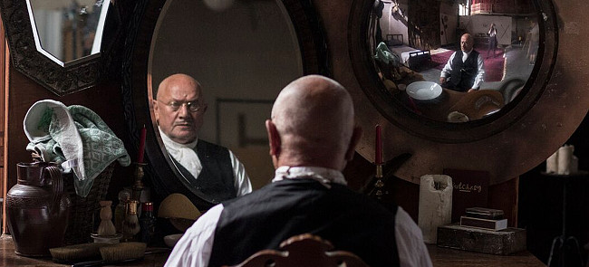 ![]() Edgar Allan Poe's iconic story becomes a rather theatrical one-man-show of a movie starring Steven Berkoff, who also adapted the screenplay. Director Stephen Cookson adds plenty of visual flourish with striking sets and costumes, plus a literal bucket of blood, creating an intensely creepy tone. So even with its stagey design, this is a properly unsettling tale of paranoia and madness that worms its way under the skin. In 1890s London, Edmund (Berkoff) is a servant haunted by how his aged master (Sutton) stares at him. So he decides to kill him, developing an elaborate plan that involves spying on him sleeping, waiting for the appearance of that evil eye. Finally he pounces, dismembering the body and stashing it under the floorboards. He's feeling confident when three policemen (Goodman, Skinner and Brailsford) arrive in the middle of the night, investigating reports of a cry for help. And Edmund becomes convinced that they will hear the old man's heart beating under the floor. Edmund recounts events both directly to camera and in babbling monologs to himself and the constables. The film is shot in arch locations on stylised sets, with hyper-dramatic lighting and a sinister score (by David Lord and Tim Wheater). Deep shadows are cast by lantern light, while Edmund tries to convince himself that he's not mad and has complete clarity about what he's doing. This is purely Berkoff's show, as the other characters really only add background texture. As always, the mesmerising Berkoff holds the audience in his grip from the moment he begins speaking. Edmund is a nervous, observant man, funny and scary in equal measure, one thing to his master and another when speaking to himself in the mirror. He insists that he's not insane, his senses are simply too acute. The actor's attention to detail is remarkable, so fully realised that he brings the gifted supporting cast to life as well. His guilty chatter to the cops is terrific, revealing the flip side of his more controlled narration. Even with his wildly entertaining flourishes, Berkoff remains faithful to Poe's memorable prose. So while the drama plays out luridly on-screen, it's the more imaginative details that spring memorably to life, sparking even more outrageous imagery in our minds. The gruesome disposal of the body is more suggestive than explicit, and it's also gleefully hideous. Poe's story is timeless because of how it internalises horror in a guilty conscience. Bringing that to the surface allows an actor to have a lot of fun. And Berkoff adds plenty of camp colour to Edmund's freaky mental meltdown.
