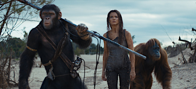 ![]() Launching a new trilogy "many generations later", this is a much more straightforward style blockbuster, with the usual action beats, contrived plot points and much more simplistic characters and situations. It's still entertaining, in a big-movie kind of way, with its enormous set pieces and twisty interaction. And director Wes Ball makes sure that it looks absolutely stunning, with state-of-the-art performance capture work from a skilled cast. In a peaceful village where chimps train eagles to hunt, young Noa (Teague) has daddy issues, never living up to the expectations of his father (Sandilands), the community's leader. Then a marauding gang of violent apes torches the village, dragging residents off to be slaves for Proximus (Durand), a tyrant who has twisted the beliefs of ancient leader Caesar. Lone survivor Noa runs to rescue his family, he runs into orangutan Raka (Macon), who teaches him the truth about Caesar's unifying pacifist philosophy. He also meets Mae (Allan), a primitive human who shockingly can speak. Set in the gorgeously rendered long-overgrown ruins of Los Angeles (there are architectural hints), the story sees Noa and company tracking Proximus' goons to his seaside lair in a rusted-out, beached ship, where another human (Macy) is helping the bonobo Proximus understand humanity and open a huge silo where human weapons have been locked for centuries. Yes, the narrative is obsessed with violence, especially of the power-hungry type, which makes the movie feel dark and weighted. Aided by the cutting-edge effects, these simian creatures emerge as fully emotive beings, with detailed movements and expressions that make them easy to identify with. Teague gives Noa an especially warm personality that's both curious and bold, building strong connections with the other characters. Despite her carefully distressed designer clothing, Allan keeps Mae intriguing and provocative. Durand and Darville (as Proximus' sadistic silverback general) are properly crazed villains. And Macon steals the show as the wise, chatty Raka. As a carefully constructed blockbuster, this movie will keep audiences riveted with its visually impressive action and untroubling themes about peace and loyalty. So we don't mind too much when the details of the plot become increasingly preposterous. Or when, in the final act, the story awkwardly shifts to introduce a whole new direction for the saga. It doesn't quite make sense, but if we don't think about that, we might be able to look forward to the next chapter. tt11389872